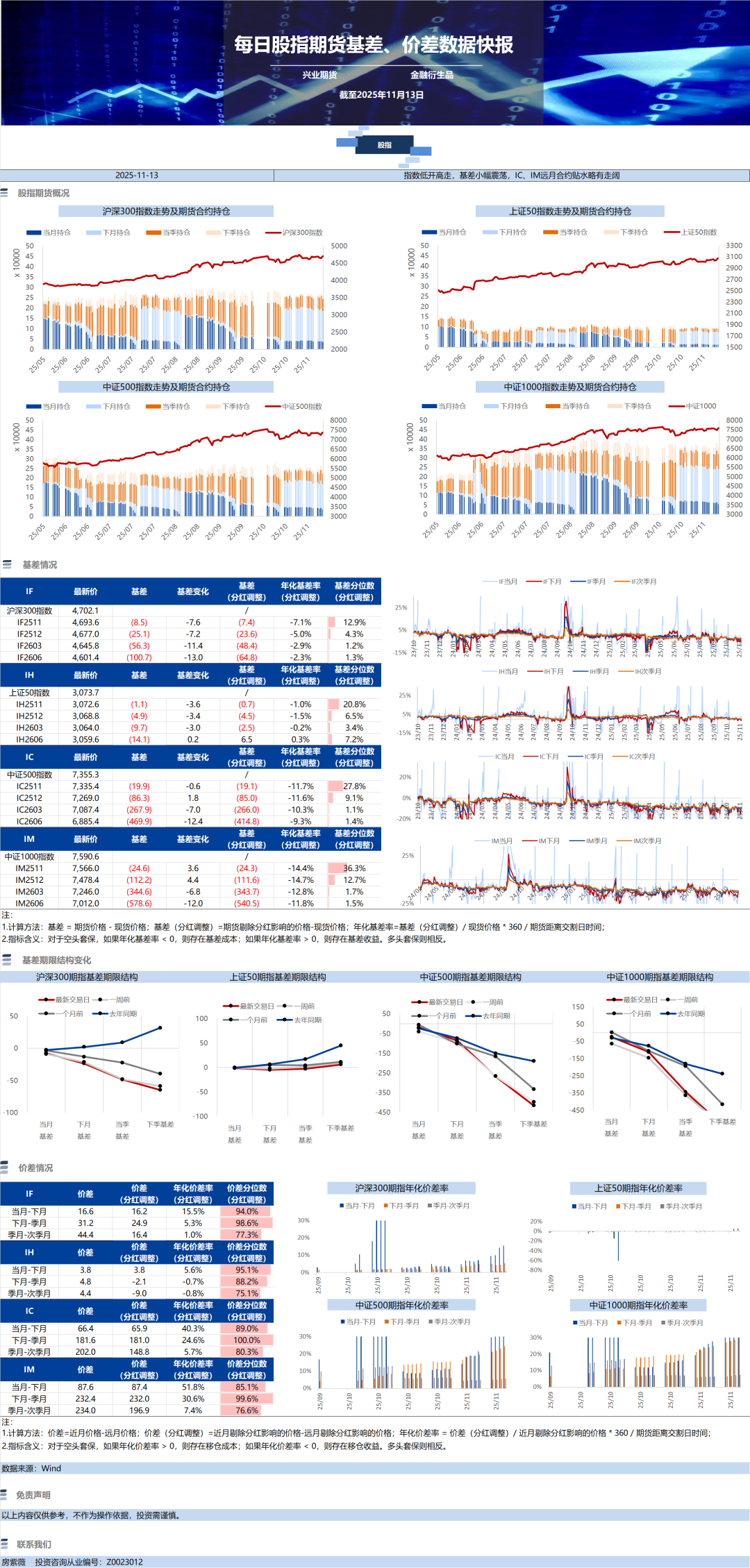 2025年11月13日 逻辑:顺周期行业回暖带动 A 股整体上扬,三季报后市场处于再定价调整,短期窄幅回调与反弹交替,下方风险有限。数据:主力合约 IC2512 贴水 86.29 点,IM2512 贴水 112.18 点,央行单日净投放 972 亿元。观点:国内股指韧性较强,建议观望为主,若深度... |