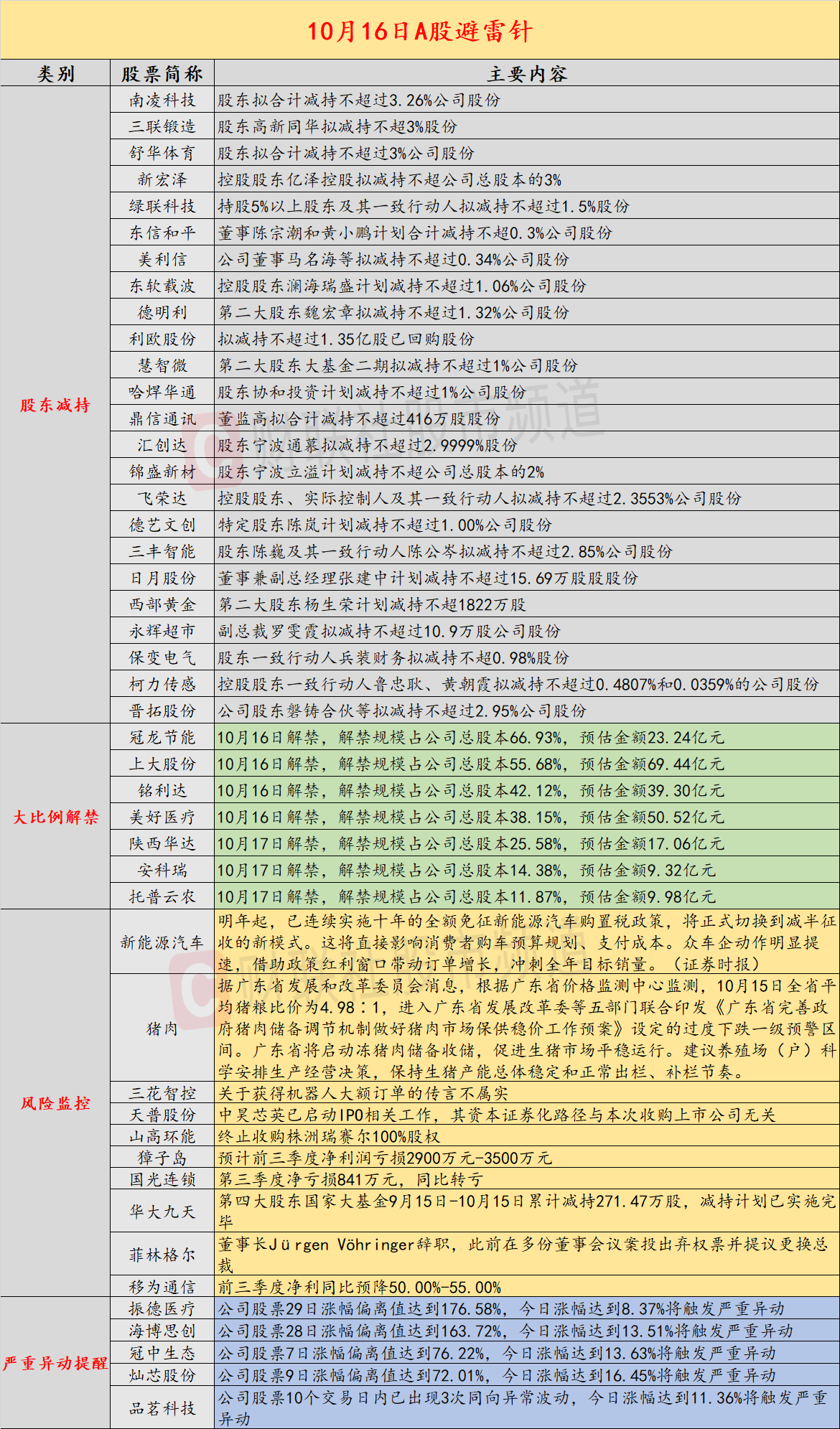 导读:财联社10月16日投资避雷针,近日,A股及海外市场潜在风险事件如下。国内经济信息方面包括:1)新能源汽车购置税明年退坡;2)广东省猪粮比价进入过度下跌一级预警区间;公司方面重点关注包括:1)三花智控公告,关于获得机器人大额订单的传言不属实;2)天普股份表示,中昊芯英已启动IPO相关工作,其资本证券化路径与本次收购上市公司无关;海外市场重点关注包括:1)美股三大指数收盘涨跌不一,稀土概念跌幅居前;2)全球公共债务占GDP的比重将创1948年以来新高。