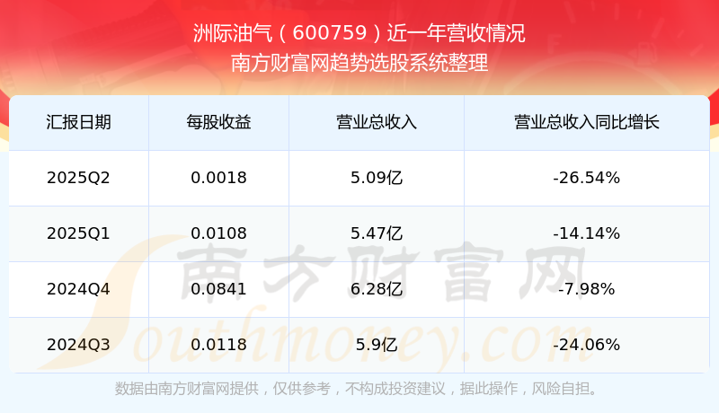 洲际油气2025年第二季度财报显示,公司主营收入5.09亿元,同比-26.54%;归母净利润719.9万元,同比-41%;扣非净利润756.65万元,同比-65.72%;