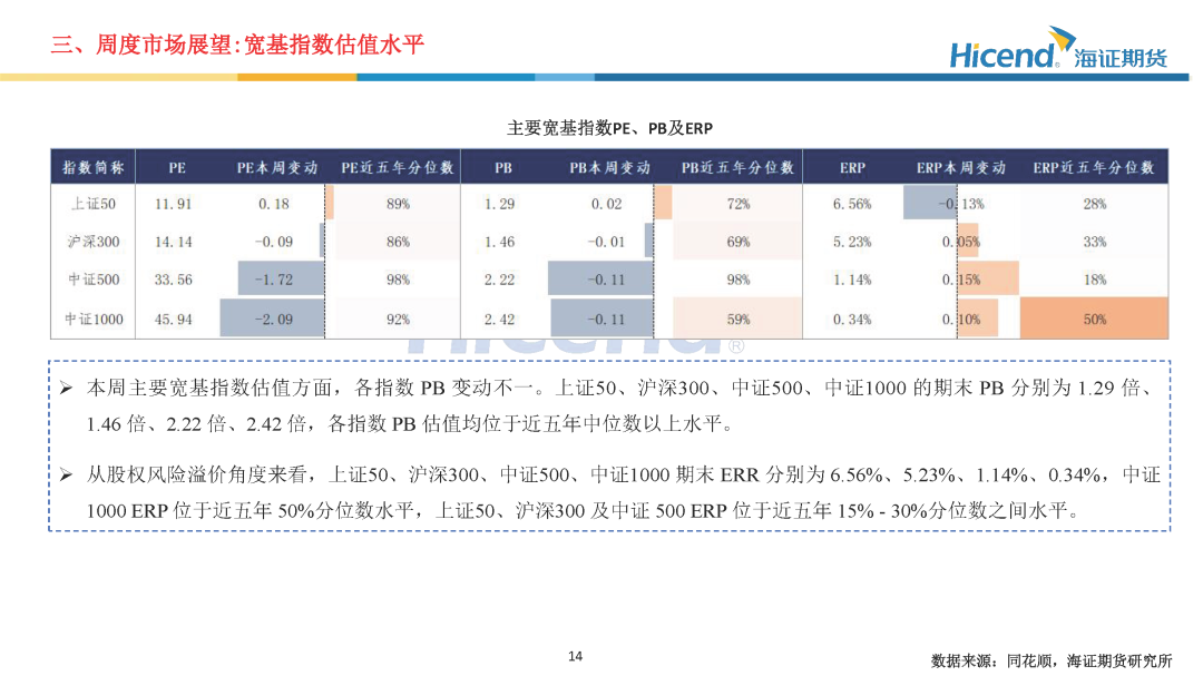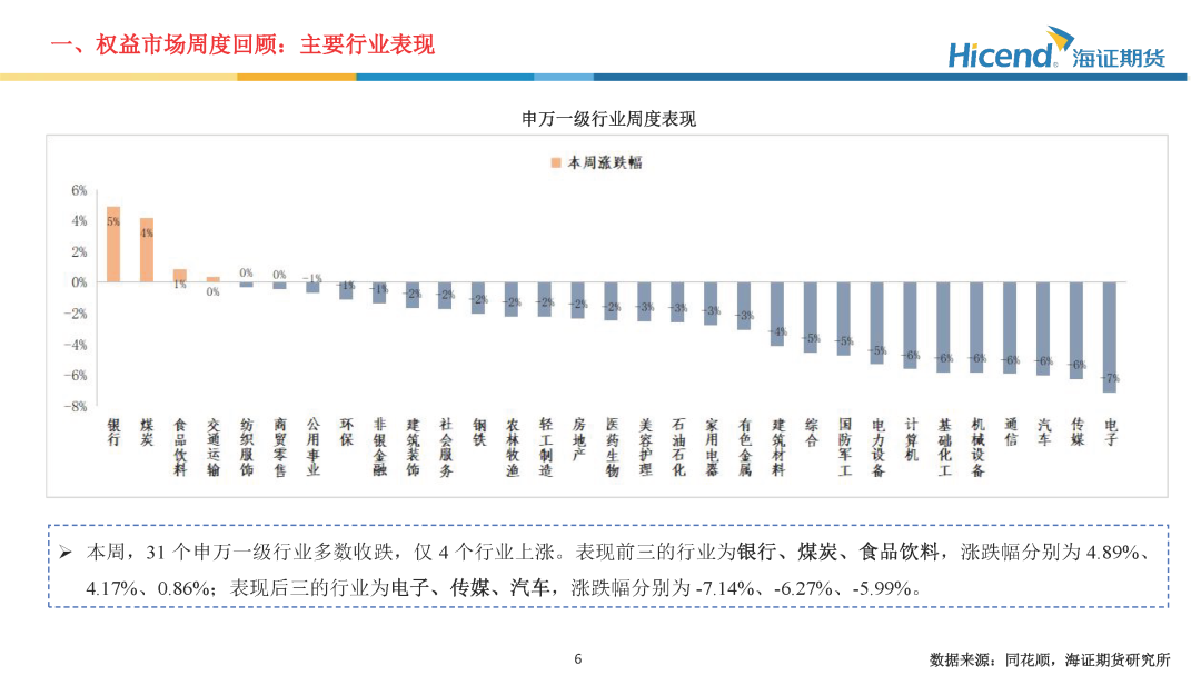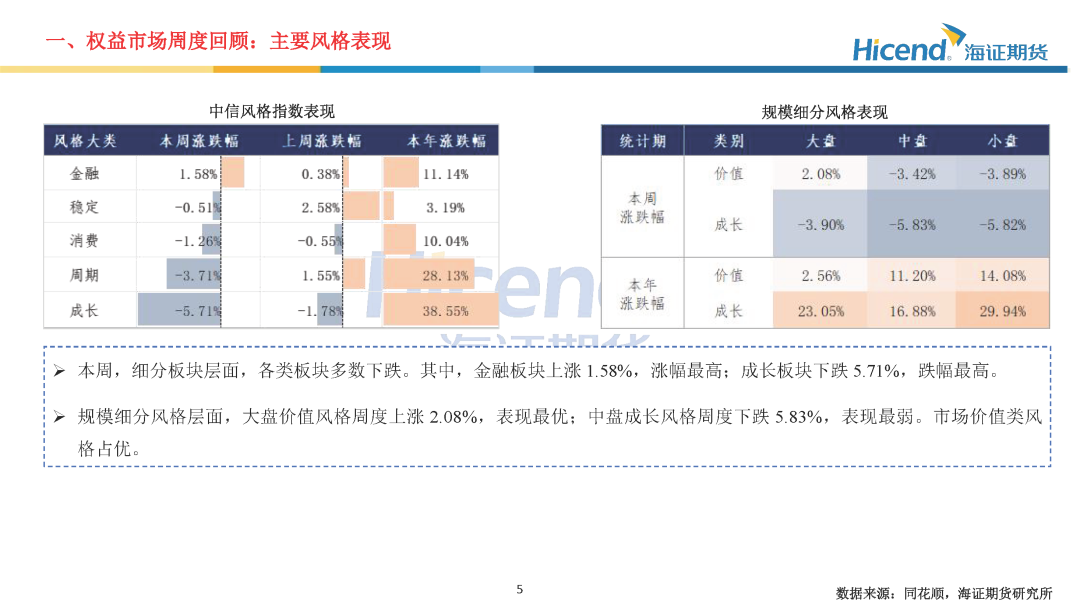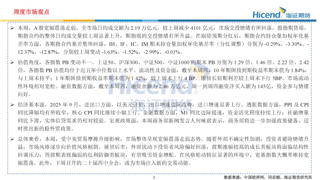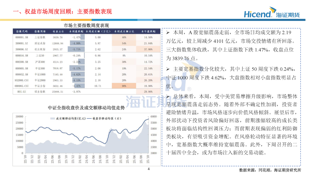总体来看,本周,受中美贸易摩擦升级影响,市场整体呈现宽幅震荡走弱态势。随着外部不确定性加剧,投资者避险情绪升温,市场风格逐步向价值风格倾斜。展望后市,外部扰动下投资者风险偏好回落,前期涨幅较高的成长类板块将面临结构性回调压力;而前期表现偏弱的红利防御类板块,有望吸引资金增配。在风格轮动特征显著的环境中,宽基指数大概率维持宽幅震荡。此外,下周召开的二十届四中全会,或为市场注入新的交易动能。