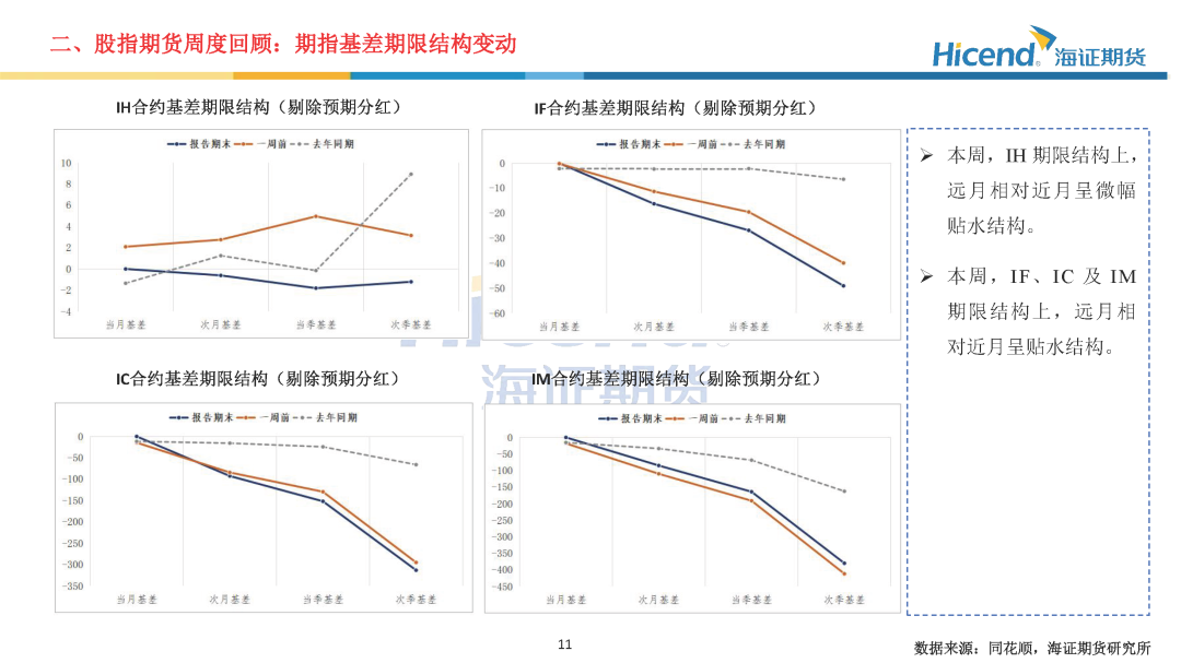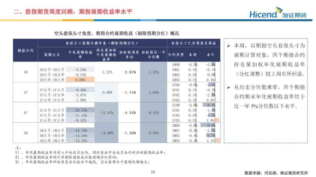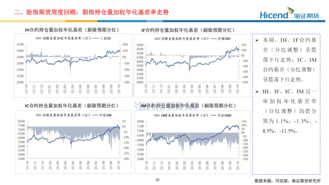本周,A股宽幅震荡走弱,全市场日均成交额为2.19万亿元,较上周减少4101亿元,市场交投情绪有所回落。股指期货端,期指合约的整体日均成交量较上周显著上升,期指端的交投情绪有所升温。在剔除预期分红后,期指合约持仓量加权年化基差率方面,各期指合约基差集体回落,IH、IF、IC、IM期末持仓量加权年化基差率(分红调整)分别为-0.29%、-3.30%、-12.37%、-12.87%,分别较上周变动-1.63%、-1.52%、-2.99%、-0.01%。