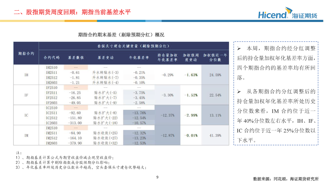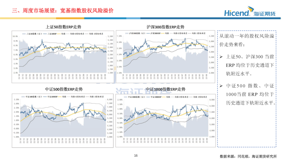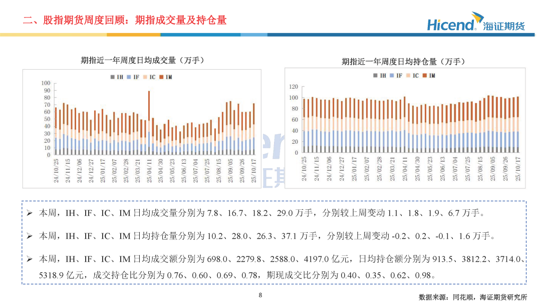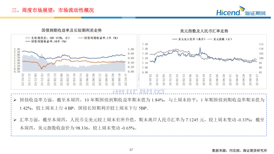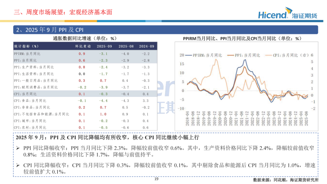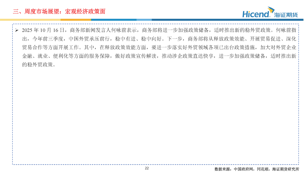 经济基本面,2025年9月,进出口方面,以美元计价,出口增速边际改善,进口增速显著上行。通胀数据方面,PPI及CPI同比降幅均有所收窄,核心CPI同比继续小幅上行。金融数据方面,M1同比边际提速,资金活化程度持续上行;社融增量同比下滑,实体信贷需求仍相对较弱。宏观政策面,本周商务部新闻发言人何咏前表示,商务部将进一步加强政策储备,适时推出新的稳外贸政策。