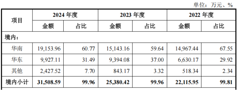 数据显示,钶锐锶超九成收入来自于华南、华东。其中,报告期内来自华南的销售收入分别为1.5亿元、1.51亿元、1.92亿元,营收占比分别为67.55%、59.64%、60.77%,2023年下滑后又有小幅攀升。同期华东的销售收入分别为6630.17万元、9394.08万元、9927.11万元,营收占比则分别为29.92%、37%、31.49%。