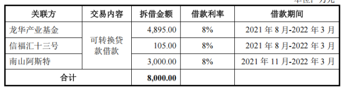 为了完成此次收购,钶锐锶于2021年向龙华产业基金、信福汇十三号、南山阿斯特3名股东合计借款8000万元,借款利率高达8%。上述借款发生年度1年期贷款市场报价利率范围为3.65%-3.8%,与钶锐锶借款利率差异幅度在4.2%-4.35%。