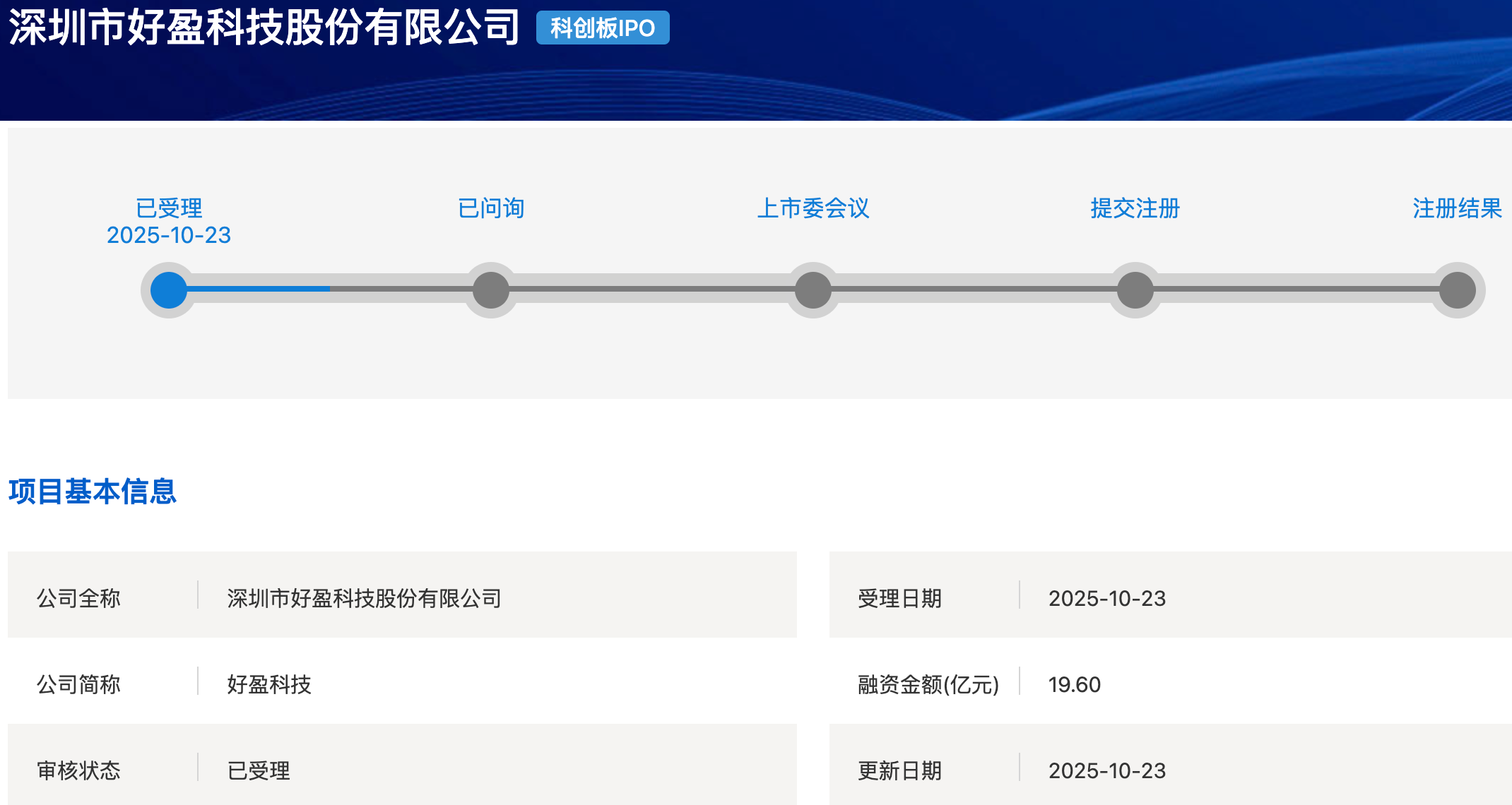 10月23日,上交所网站显示,深圳市好盈科技股份有限公司(简称“好盈科技”)科创板IPO获受理,公司拟募资19.6亿元。
