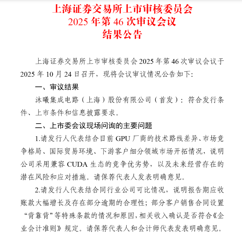 上市委在会议现场问询的主要问题包括,沐曦股份结合目前GPU厂商的技术路线差异、市场竞争格局、国际贸易环境、下游客户细分领域市场开拓情况,说明公司采用兼容CUDA生态的竞争优劣势,以及未来经营存在的潜在风险和应对措施。此外,公司结合同行业公司可比情况,说明报告期应收账款大幅增长及存在部分逾期的合理性。