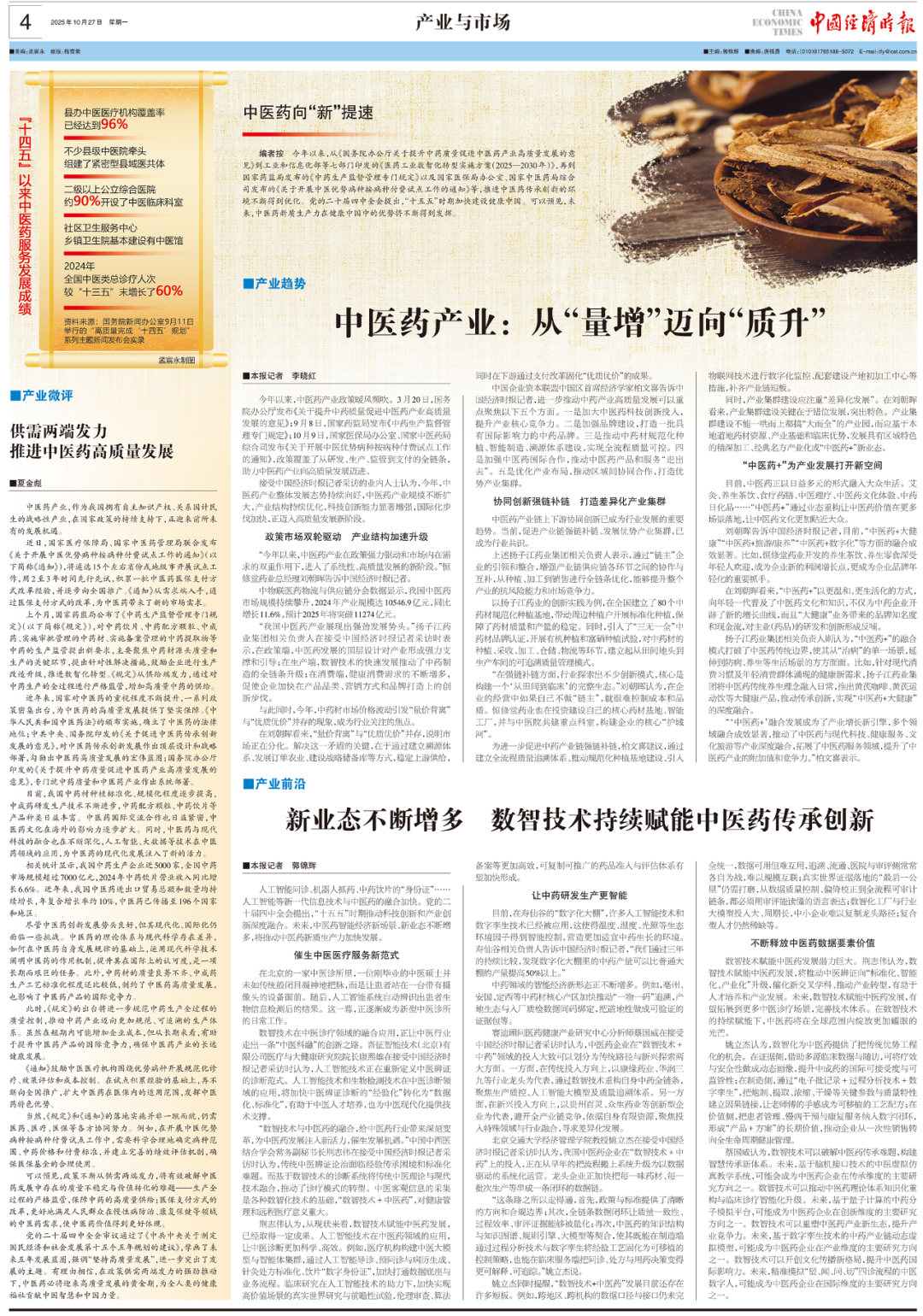编者按今年以来,从《国务院办公厅关于提升中药质量促进中医药产业高质量发展的意见》到工业和信息化部等七部门印发的《医药工业数智化转型实施方案(2025—2030年)》,再到国家药监局发布的《中药生产监督管理专门规定》以及国家医保局办公室、国家中医药局综合司发布的《关于开展中医优势病种按病种付费试点工作的通知》等,推进中医药传承创新的环境不断得到优化。党的二十届四中全会提出,“十五五”时期加快建设健康中国。可以预见,未来,中医药新质生产力在健康中国中的优势将不断得到发挥。