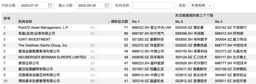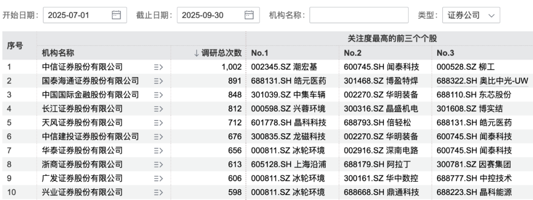 第三季度,证券公司方面,中信证券调研总次数最多,达1002次,该机构关注度最高的前三个股为:潮宏基)