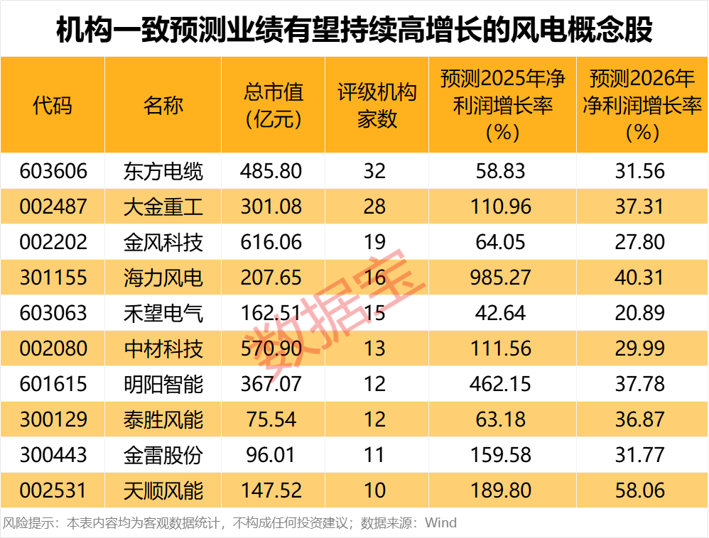 机构看好风电板块长期发展前景,预测多股2025年、2026年业绩有望持续高增长。按照评级机构家数至少10家及以上,机构一致预测2025年、2026年净利润增幅均超20%筛选,有10只风电概念股入围。东方电缆)