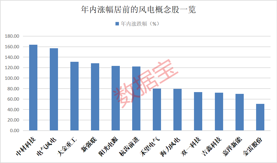 据证券时报.数据宝统计,近60只风电概念股今年年内股价平均上涨33.65%,仅7股年内股价录得下跌,不少概念股年内行情表现相当亮眼,股价实现翻倍。
