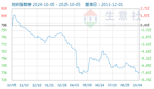 10月5日生意社纺织指数为736点,与昨日持平,较周期内最高点1156点(2018-09-03)下降了36.33%,较2020年08月13日最低点681点上涨了8.08%。(注:周期指2011-12-01至今)