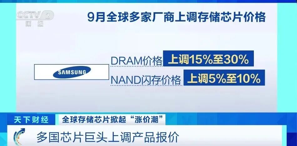 据央视新闻报道,9月下旬,韩国三星电子向主要客户发出第四季度提价通知,计划将部分DRAM价格上调15%至30%,NAND闪存价格上调5%至10%。美国芯片制造商美光在9月一度暂停部分存储芯片报价,恢复报价后,新价格普遍上涨约20%。另一存储芯片巨头闪迪也已在9月上调NAND闪存报价,幅度约为10%,消费级与企业级产品均有涉及。