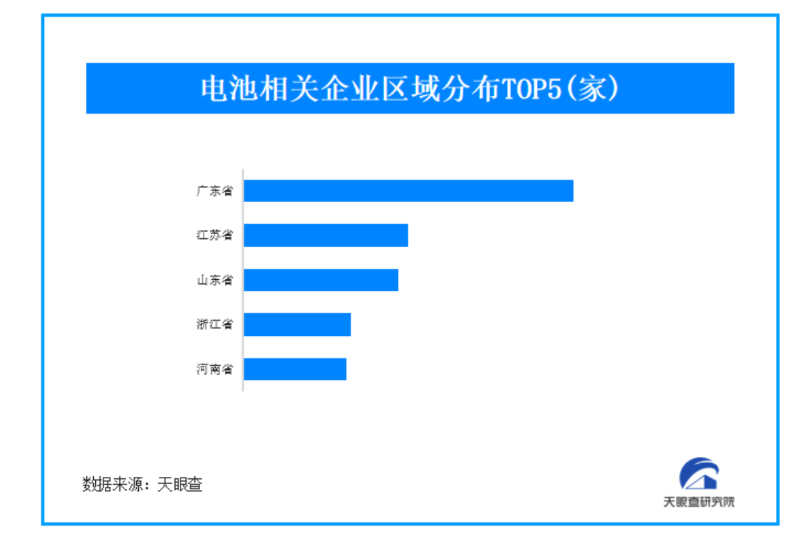 天眼查专业版数据显示,截至目前,我国现存电池相关的企业有122.6万余家,从地域分布上看,广东省、江苏省、山东省电池相关企业数量位居前列,分别拥有25.2万余家、12.6万余家、11.9万余家;从成立时间来看,超六成的相关企业成立于1-5年之间,成立于1年内的相关企业占比35.01%。
