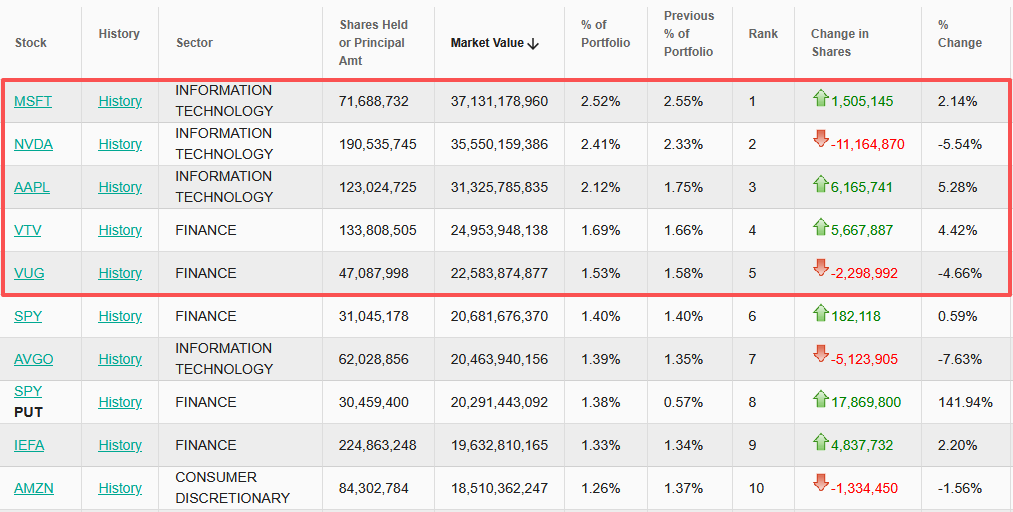 Vanguard价值股ETF(VTV.US)位列第四,持仓约1.34亿股,持仓市值约为250亿美元,占投资组合比例为1.69%,较上季度的持仓数量增加4.42%。