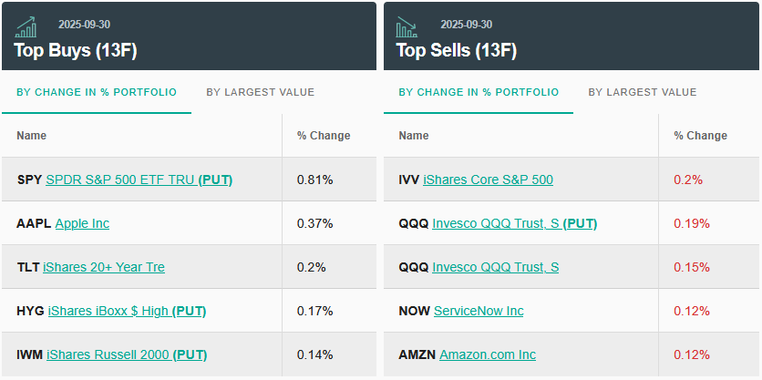 前五大卖出标的分别是:iShares标普500指数ETF(IVV.US)、纳斯达克100指数ETF看跌期权(QQQ.US,PUT)、纳斯达克100指数ETF(QQQ.US)、ServiceNow(NOW.US)、亚马逊(AMZN.US)。