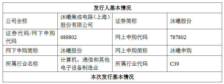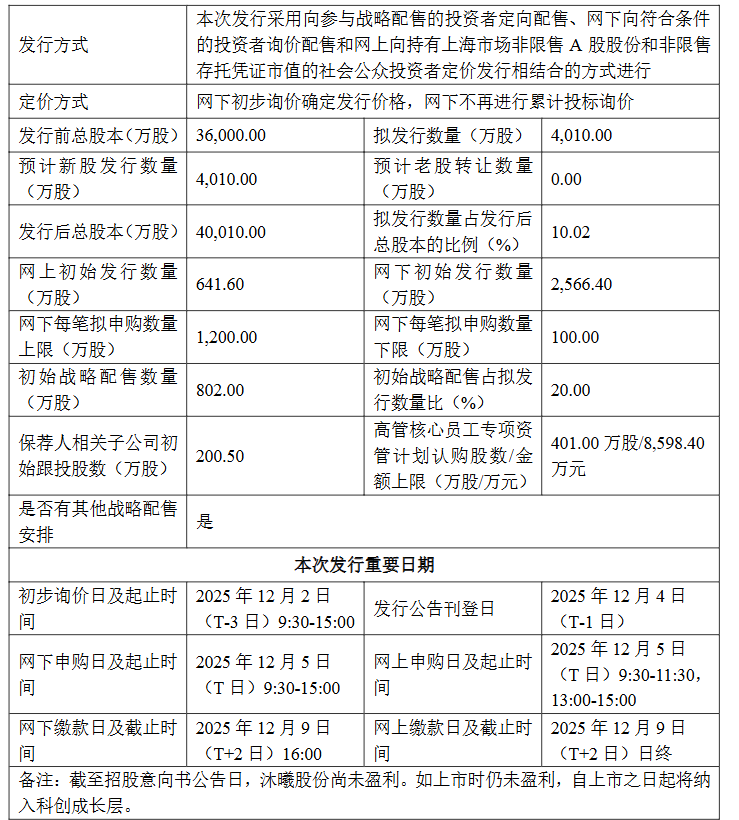 【大河财立方消息】11月26日,沐曦股份发布首次公开发行股票并在科创板上市发行安排及初步询价公告,本次发行拟发行数量4010万股,初始战略配售数量802万股,网上申购代码787802,初步询价日2025年12月2日,申购日2025年12月5日。