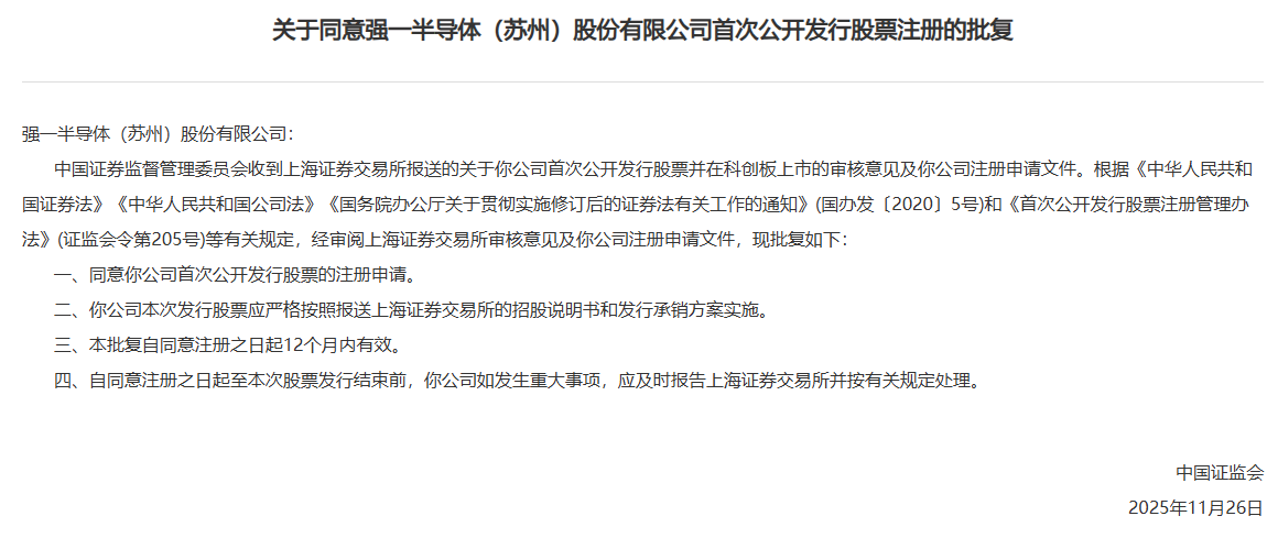 11月27日,中国证监会发布《关于同意强一半导体(苏州)股份有限公司首次公开发行股票注册的批复》。据悉,强一股份拟在上交所科创板上市,中信建投)