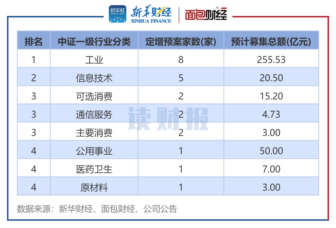 从行业分布来看,以中证行业统计,2025年10月,工业行业发布8起定增预案,拟募资额合计超255.53亿元,数量和金额均排在各行业之首;其次是信息技术行业,有5起定增预案。