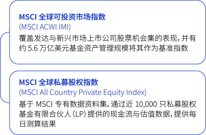 新推出的指数结合了 MSCI 的旗舰指数 MSCI 全球可投资市场指数(MSCI ACWI IMI),以及全新的 MSCI 全球私募股权指数(MSCI All Country Private Equity Index):这一综合性策略使该指数能够在统一的全球框架下,同时反映可投资的上市公司股票表现及由模型测算的私募股权敞口。