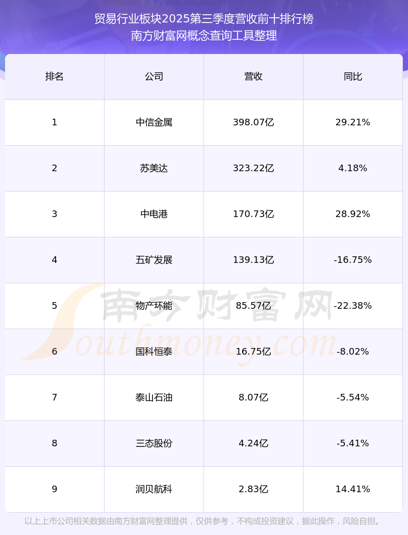 按照概念查询工具统计,该股所属板块为贸易行业板块,该板块共有9只股票,庚星股份2025第三季度营收在该板块中排名为第9名,该板块2025第三季度营收排名前十的股票如下表: