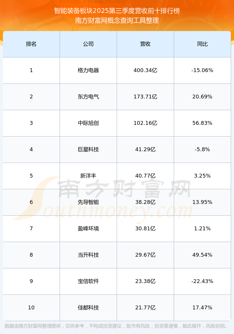 按照概念查询工具统计,该股所属板块为智能装备板块,该板块共有68只股票,景业智能2025第三季度营收在该板块中排名为第68名,该板块2025第三季度营收排名前十的股票如下表:
