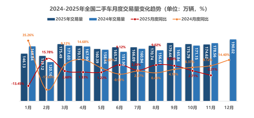 2025年11月,全国二手车市场交易量174.62万辆,环比下降0.67%,同比下降2.21%,交易金额为1119.36亿元。