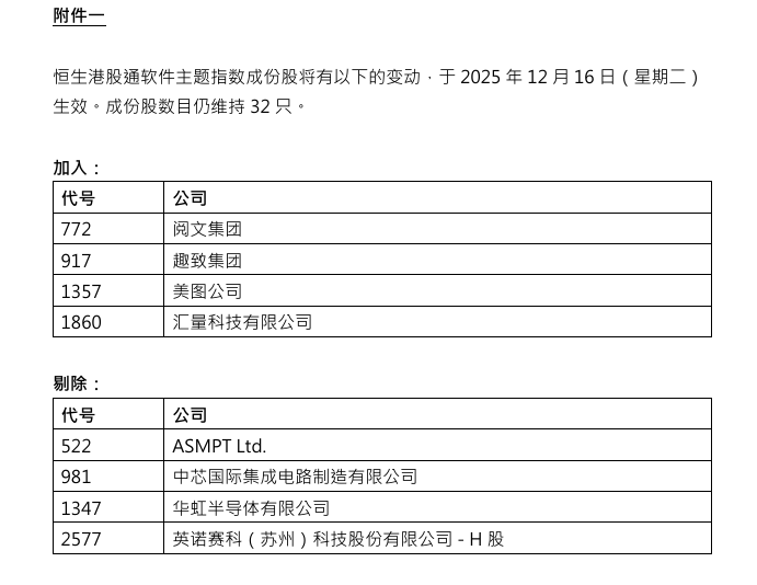 12月11日,恒生指数公司发布通告,恒生港股通软件及半导体指数将改名为恒生港股通软件主题指数,编算方法亦将更新,成份股数目固定为40只。加入阅文集团(00772)、趣致集团(00917)、美图(01357)、汇量科技(01860)四只股份,剔除ASMPT(00522)、中芯国际(00981)、华虹半导体(01347)等几只股票,指数的重新命名及相关的成份股变动将于2025年12月16日生效。成份股数目仍维持32只。 此外其编算方法更新还包括:更改指数目的、选股范畴、行业要求和成份股挑选方法;新增主题要求、缓冲区和快速纳入规则。
