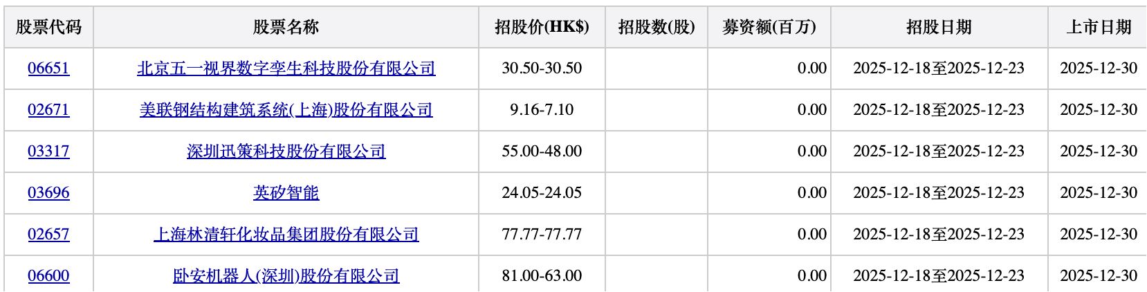 今日开启招股的六家公司分别为英矽智能(HK03696)、林清轩(HK02657)、卧安机器人(HK06600)、五一视界(HK06651)、迅策(HK03317)和美联股份(HK02671)。根据计划,这六家公司有望于12月30日集体在港交所上市。截至2025年12月30日,港交所今年预计将有超过117家新公司完成上市交易。