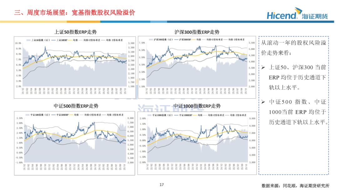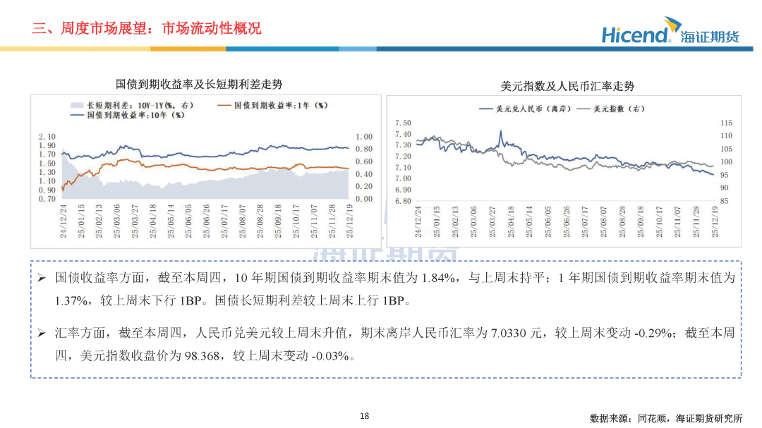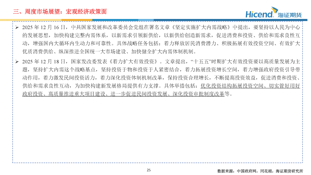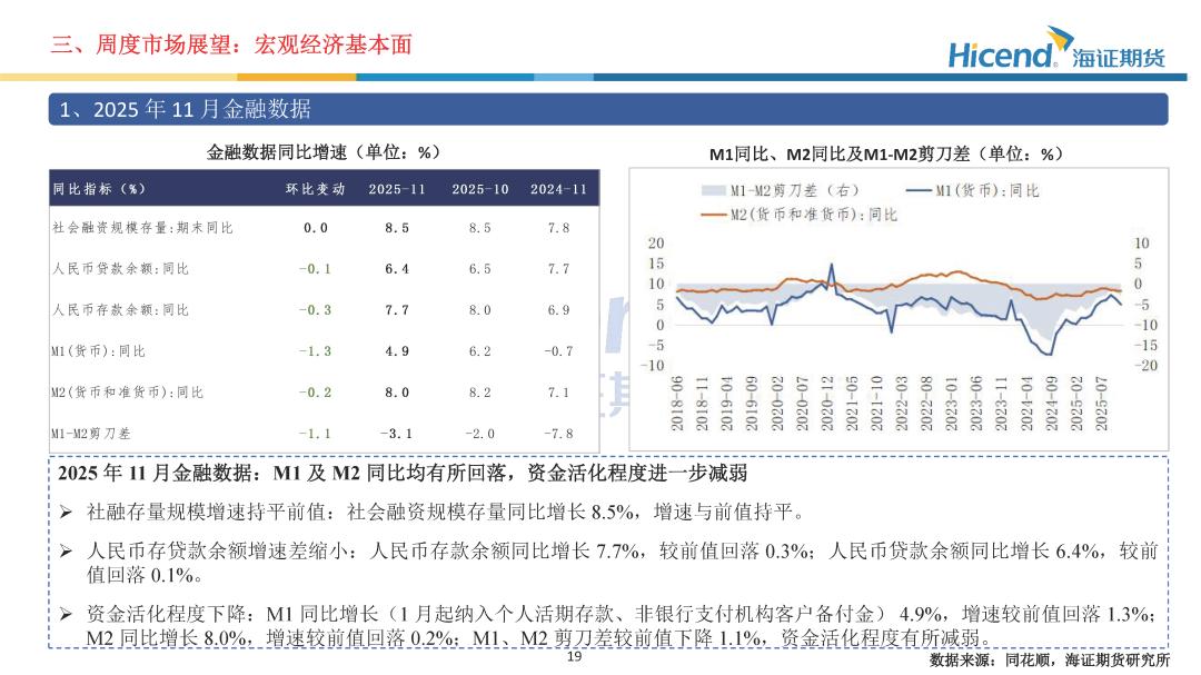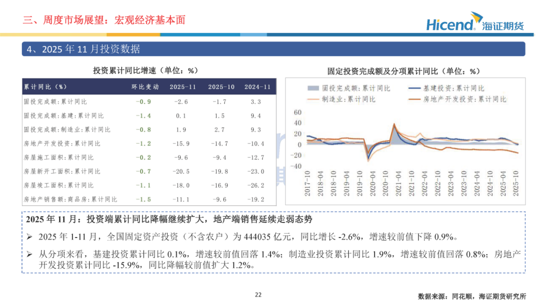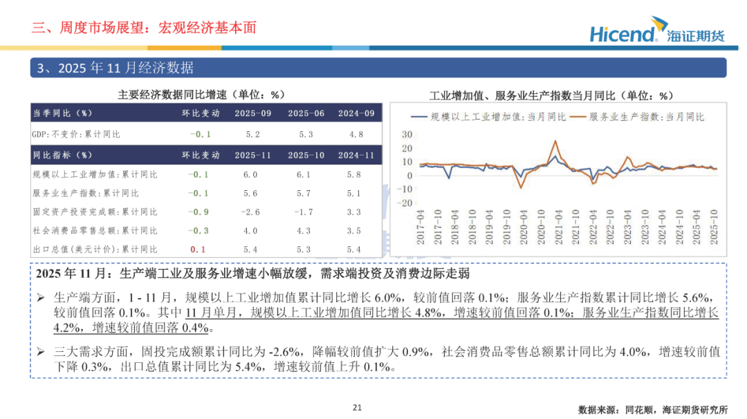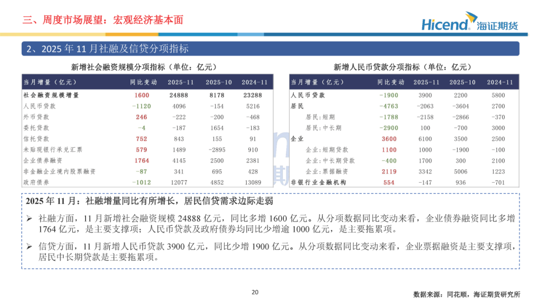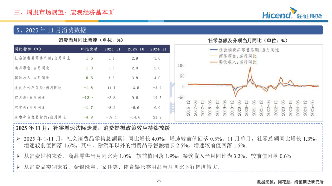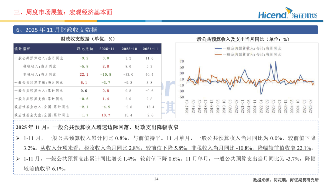 经济基本面,2025年11月金融数据方面,M1及M2同比均有所回落,资金活化程度进一步减弱;社融增量同比有所增长,居民信贷需求边际走弱。经济数据方面,生产端工业及服务业增速小幅放缓,需求端投资及消费边际走弱。生产端,规模以上工业增加值当月同比边际回落0.1%,服务业生产指数当月同比边际回落0.4%。三大需求方面:1)、投资端累计同比降幅继续扩大,地产端销售延续走弱态势;2)、社零增速边际走弱,消费提振政策效应持续放缓;3)、出口当月同比5.9%,增速较前值上升7.0%。财政数据方面,一般公共预算收入增速边际回落,财政支出降幅收窄。