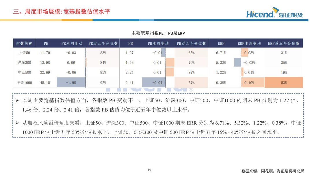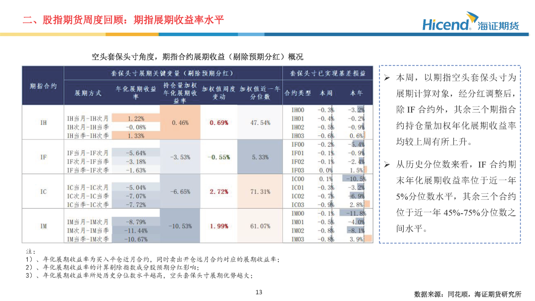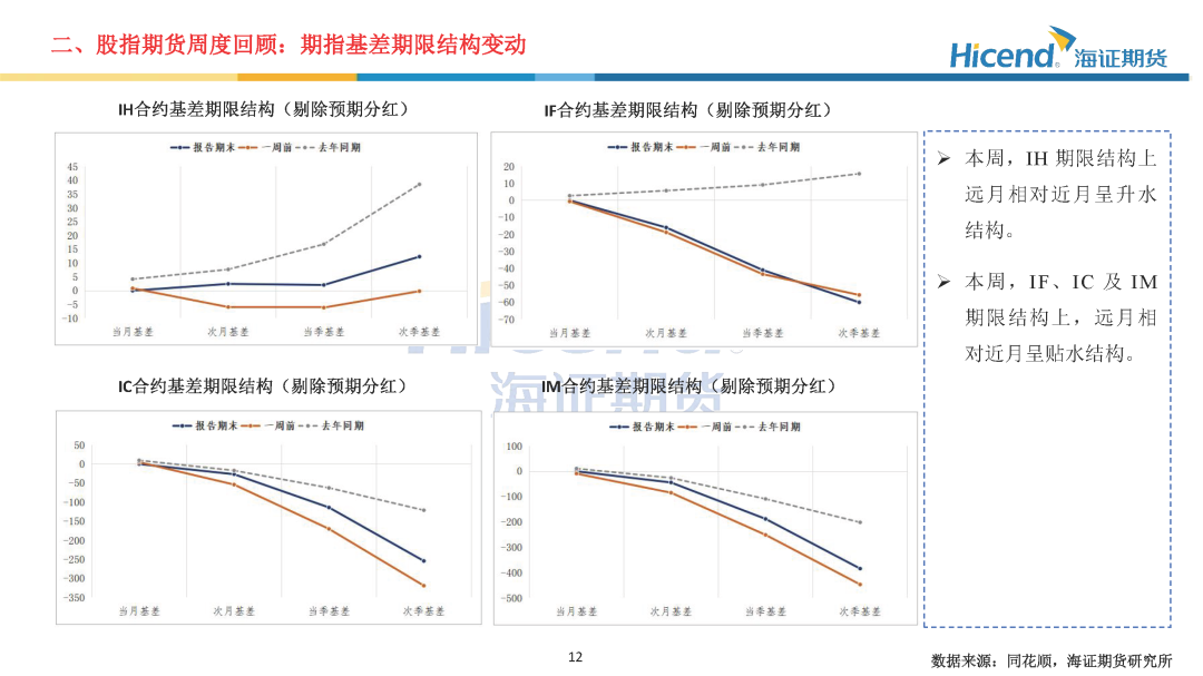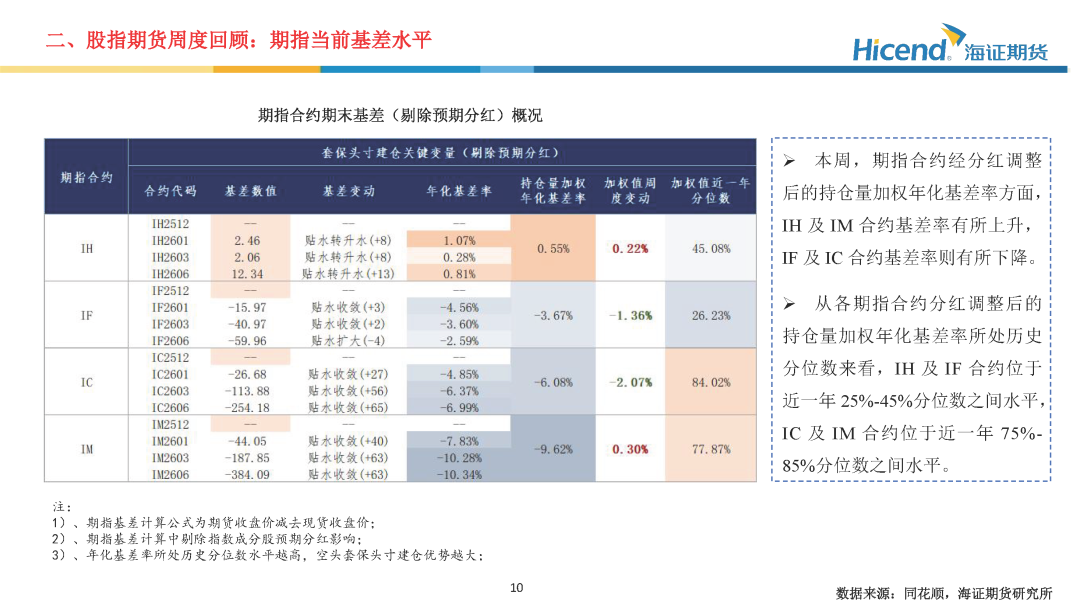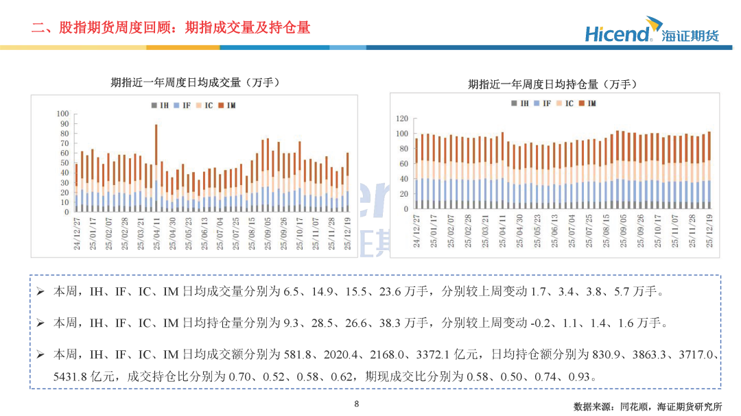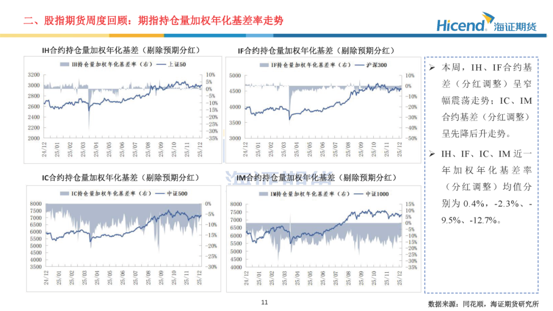 本周,A股延续震荡格局,全市场日均成交额为1.76万亿元,较上周减少1925亿元,市场成交活跃度回落。三大指数涨跌不一,其中上证指数上涨0.03%,收盘点位为3890.45点。股指期货端,期指合约的整体日均成交量较上周有所上升,期指端的交投情绪有所上升。在剔除预期分红后,期指合约持仓量加权年化基差率方面,IH、IF、IC、IM期末持仓量加权年化基差率(分红调整)分别为0.55%、-3.67%、-6.08%、-9.62%,分别较上周变动0.22%、-1.36%、-2.07%、0.30%。