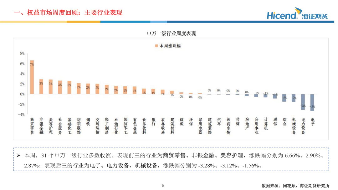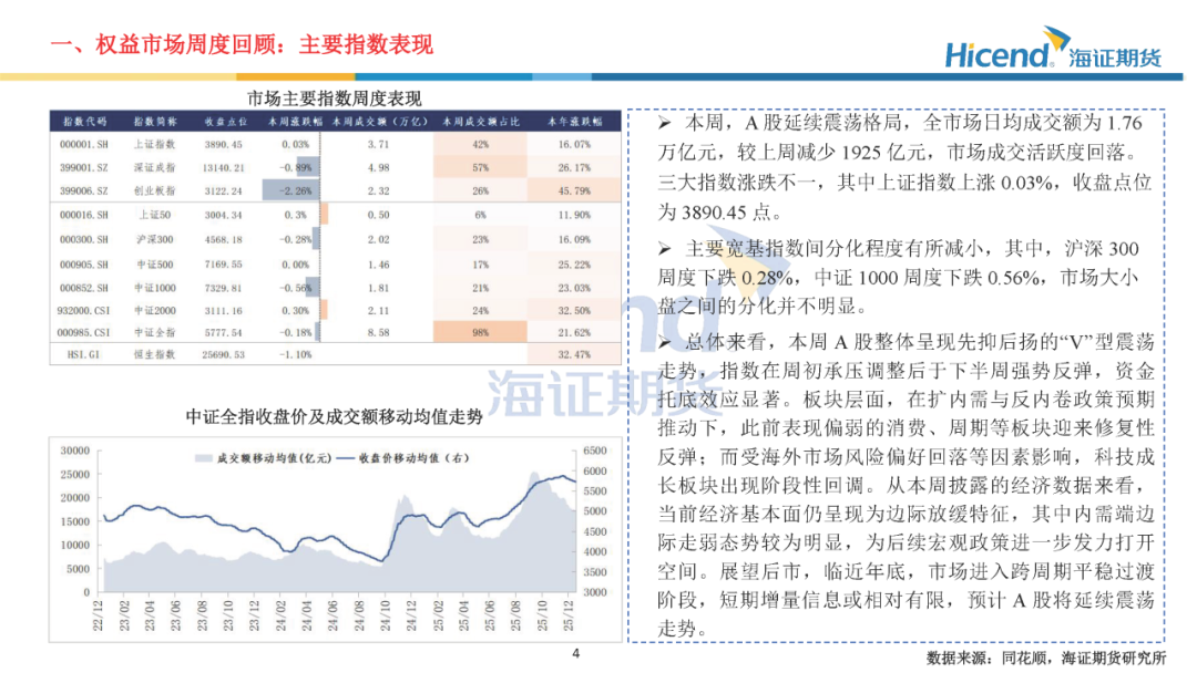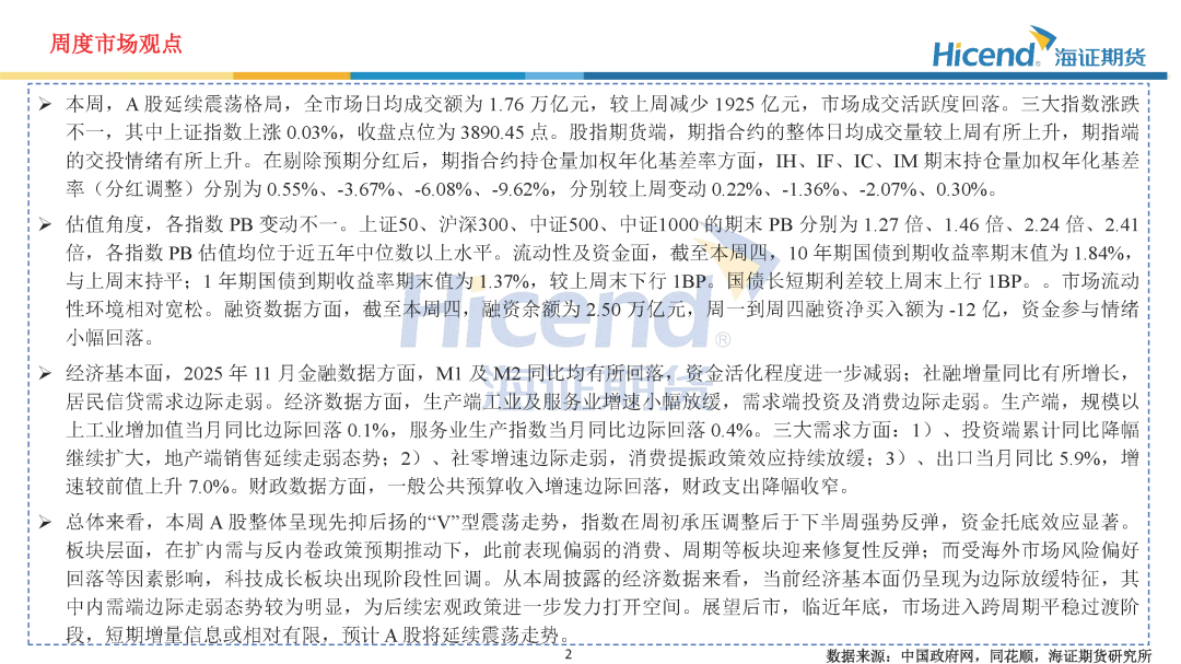 总体来看,本周A股整体呈现先抑后扬的“V”型震荡走势,指数在周初承压调整后于下半周强势反弹,资金托底效应显著。板块层面,在扩内需与反内卷政策预期推动下,此前表现偏弱的消费、周期等板块迎来修复性反弹;而受海外市场风险偏好回落等因素影响,科技成长板块出现阶段性回调。从本周披露的经济数据来看,当前经济基本面仍呈现为边际放缓特征,其中内需端边际走弱态势较为明显,为后续宏观政策进一步发力打开空间。展望后市,临近年底,市场进入跨周期平稳过渡阶段,短期增量信息或相对有限,预计A股将延续震荡走势。