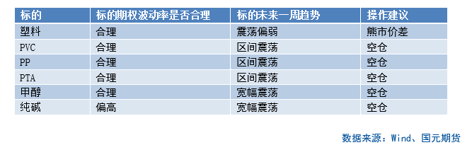本周原油延续震荡走低趋势,化工主力合约逐步从01合约转向05合约,本周部分品种有所反弹。PVC方面,当前基本面仍承压,但短期供需关系有所改善;当前产量仍处于较高水平,出口签单较为积极,预期短期转为震荡走势。投资者可考虑将PVC认购熊市价差组合止盈平仓。 化工期权策略回顾 图表1化工期权策略回顾