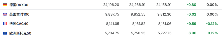 2.截至发稿,德国DAX指数跌0.00%,英国富时100指数跌0.00%,法国CAC40指数跌0.12%,欧洲斯托克50指数跌0.12%。