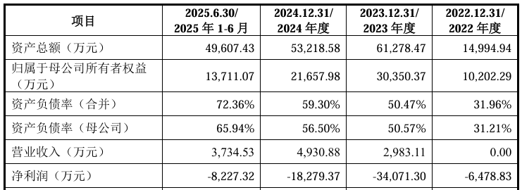 财务方面,于2022年度、2023年度、2024年度及2025年1-6月,公司实现营业收入分别为0、2983.11万元、4930.88万元、3734.53万元人民币;同期,净利润分别约为-6478.83万元、-3.41亿元、-1.83亿元、-8227.32万元人民币。