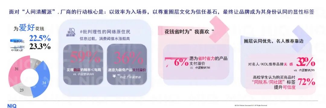 在消费市场迭代升级的浪潮中,Z世代这一被贴上“人间清醒派”标签的群体,展现出极具矛盾又高度统一的消费图景:31%的人乐于消费,享受品质与体验带来的满足感;35%的人却秉持谨慎态度,拒绝盲目买单。他们生长于信息爆炸与新品迭出的时代,海量信息赋予了他们清醒的批判视角,既不盲从名人推荐,也不轻易被大众潮流裹挟。洞悉Z世代的消费属性,成为品牌抢占市场先机的关键所在。