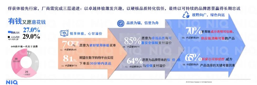 随着消费市场的代际迭代,千禧一代已逐渐成为消费主力军。数据显示,70%的千禧一代消费者愿意为更好的使用体验买单,85%愿意为卓越品质与可靠安全保障支付溢价,70%更青睐成分透明可信赖、供应链清晰可靠的产品。