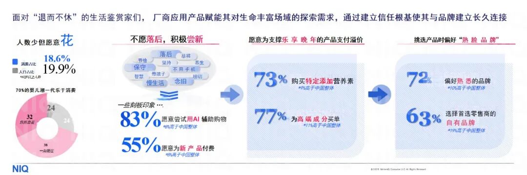 在老龄化浪潮与消费升级的双重驱动下,中国银发经济正经历从生存保障到品质享老的深刻变革。1962-1975年出生的婴儿潮一代展现出颠覆传统认知的消费特征。其中,70%的积极消费意愿、83%接受AI购物、55%的新产品付费率,正在重塑市场的价值逻辑。