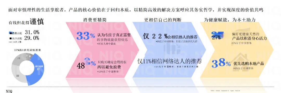 作为中国最具消费实力的中生代群体,X世代(1965-1980年出生)正以独特的消费哲学重塑市场格局。他们既是家庭经济决策的中枢,又是消费转型的实践者。《报告》指出,37%的X世代在消费上持谨慎态度,48%只购买确定会用的东西,注重消费的实用性和必要性。对于品牌而言,要想撬动这一部分人的消费意愿,就必从产品本质、品牌认同、信任构建、三个维度切入,实现供需精准匹配: