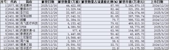 临近岁末,港股多只次新股集中迎来限售股解禁,考验市场流动性。
