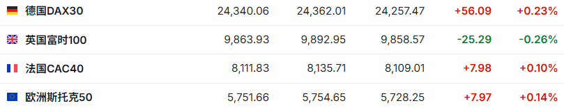 2.截至发稿,德国DAX指数涨0.23%,英国富时100指数跌0.26%,法国CAC40指数涨0.10%,欧洲斯托克50指数涨0.14%。
