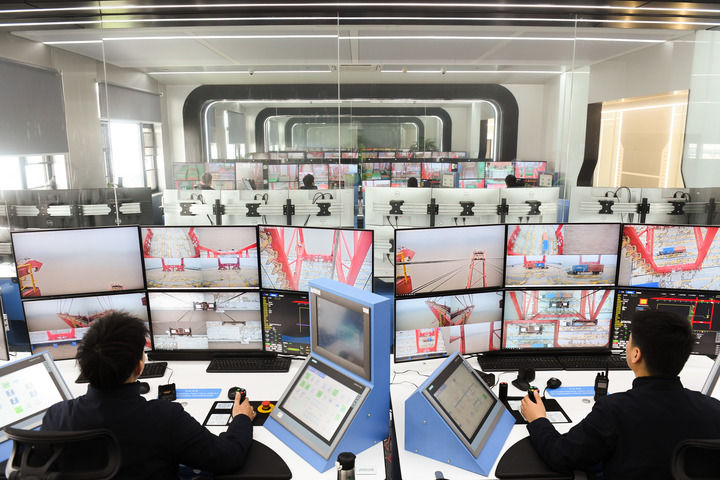宁波舟山港梅山港区的远控操作室内6块屏幕从不同角度清晰呈现作业画面桥吊司机左右手配合轻推摇杆在约3公里外的码头上桥吊将一个个集装箱快速稳定完成装卸