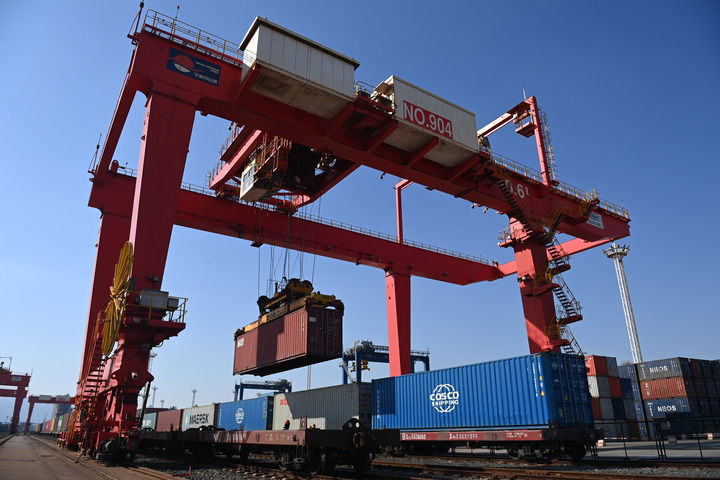 2024年1月24日在宁波舟山港铁路北仑港站龙门吊在装卸海铁联运班列的集装箱新华社记者 黄宗治 摄