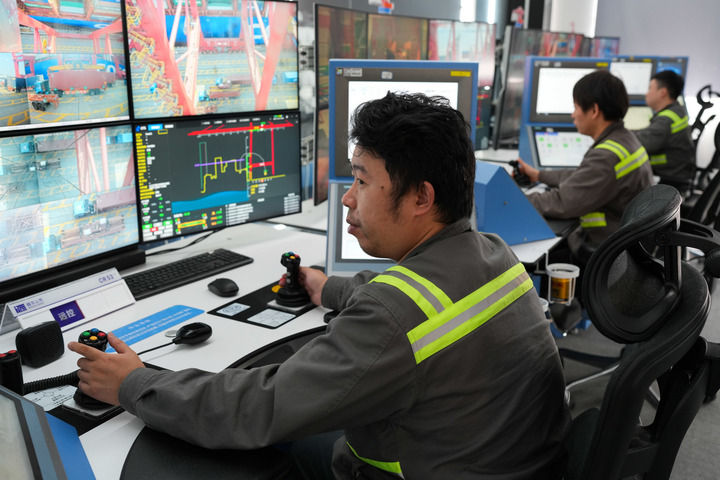 工作人员在宁波舟山港梅山港区的远控操作室内装卸集装箱2025年12月2日摄新华社记者 翁忻旸 摄