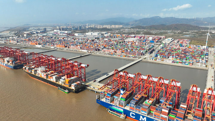 货轮在宁波舟山港梅山港区装卸货物无人机照片2025年12月2日摄新华社记者 翁忻旸 摄