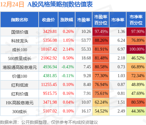 风格策略指数方面,国信价值的市盈率百分位较高,为97.49%。而300成长的市盈率百分位较低,为54.52%。