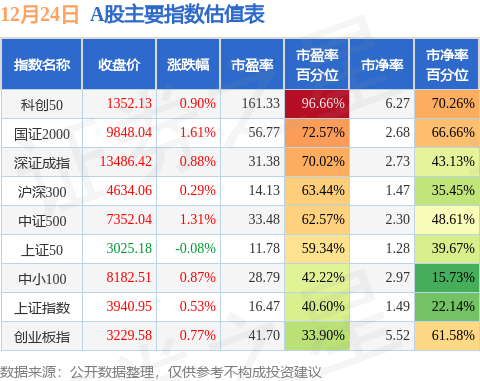 A股主要宽基指数方面,科创50的市盈率百分位较高,为96.66%。而创业板指的市盈率百分位较低,为33.9%。