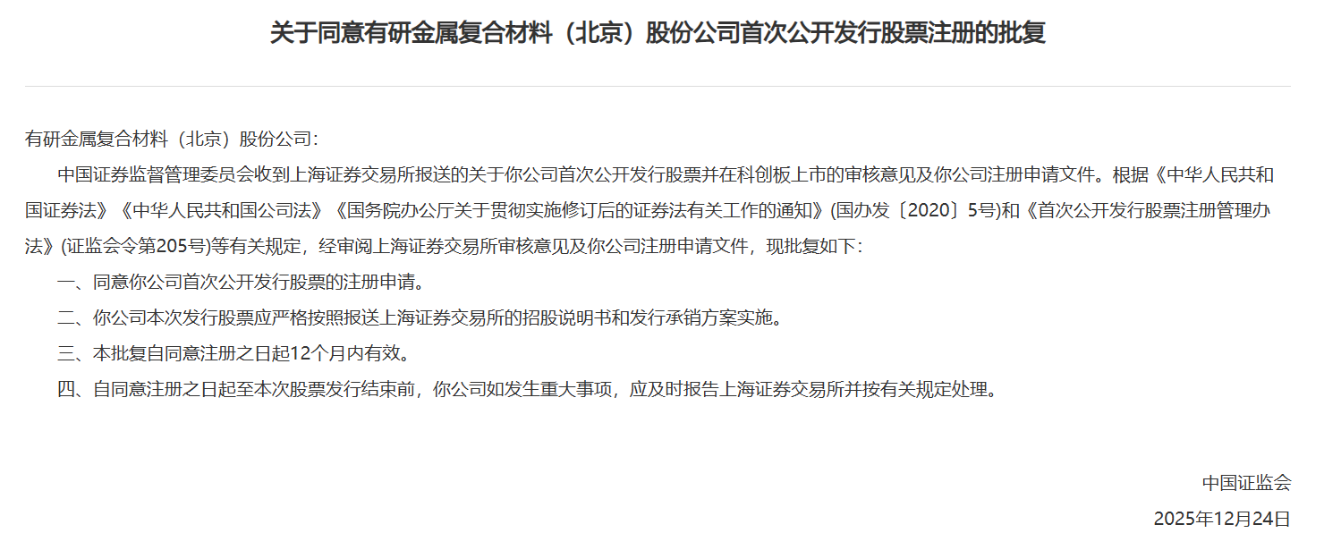 12月25日,中国证监会发布《关于同意有研金属复合材料(北京)股份公司首次公开发行股票注册的批复》。据悉,有研复材拟在上交所科创板上市,中信证券为保荐机构,拟募资9亿元。