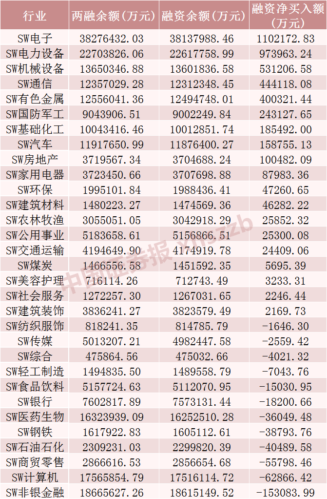 从行业看,上周申万一级31个行业中有19个行业融资余额增加,电子、电力设备、机械设备行业融资净买入金额居前,分别为110.22亿元、97.40亿元、53.12亿元。在出现融资余额减少的12个行业中,非银金融、计算机、商贸零售行业融资净卖出金额居前,分别为15.31亿元、6.29亿元、5.58亿元。