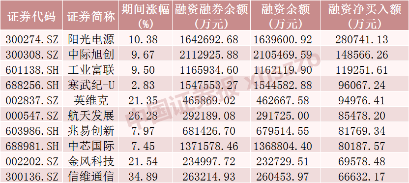 从个股看,上周融资客对168只股票加仓金额超1亿元,加仓金额居前的10只股票分别为阳光电源、中际旭创)