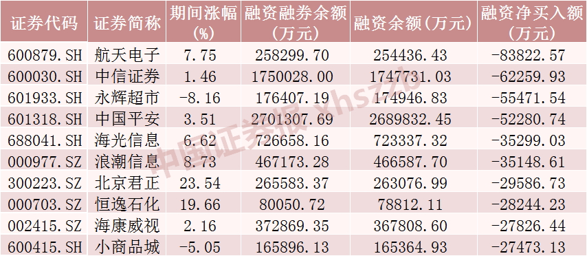 上周融资客对60只股票减仓超1亿元,减仓金额居前的10只股票分别为航天电子、中信证券)